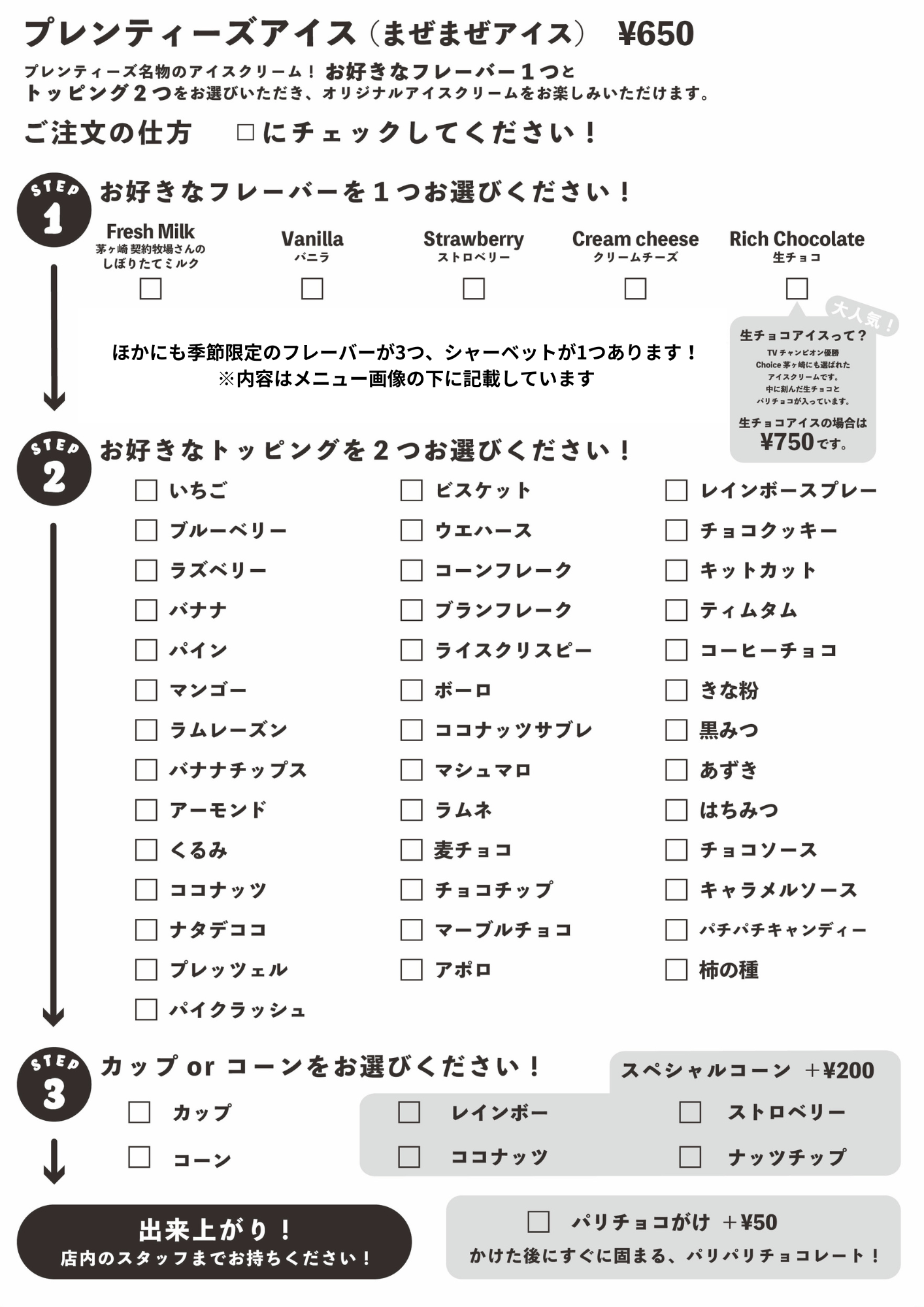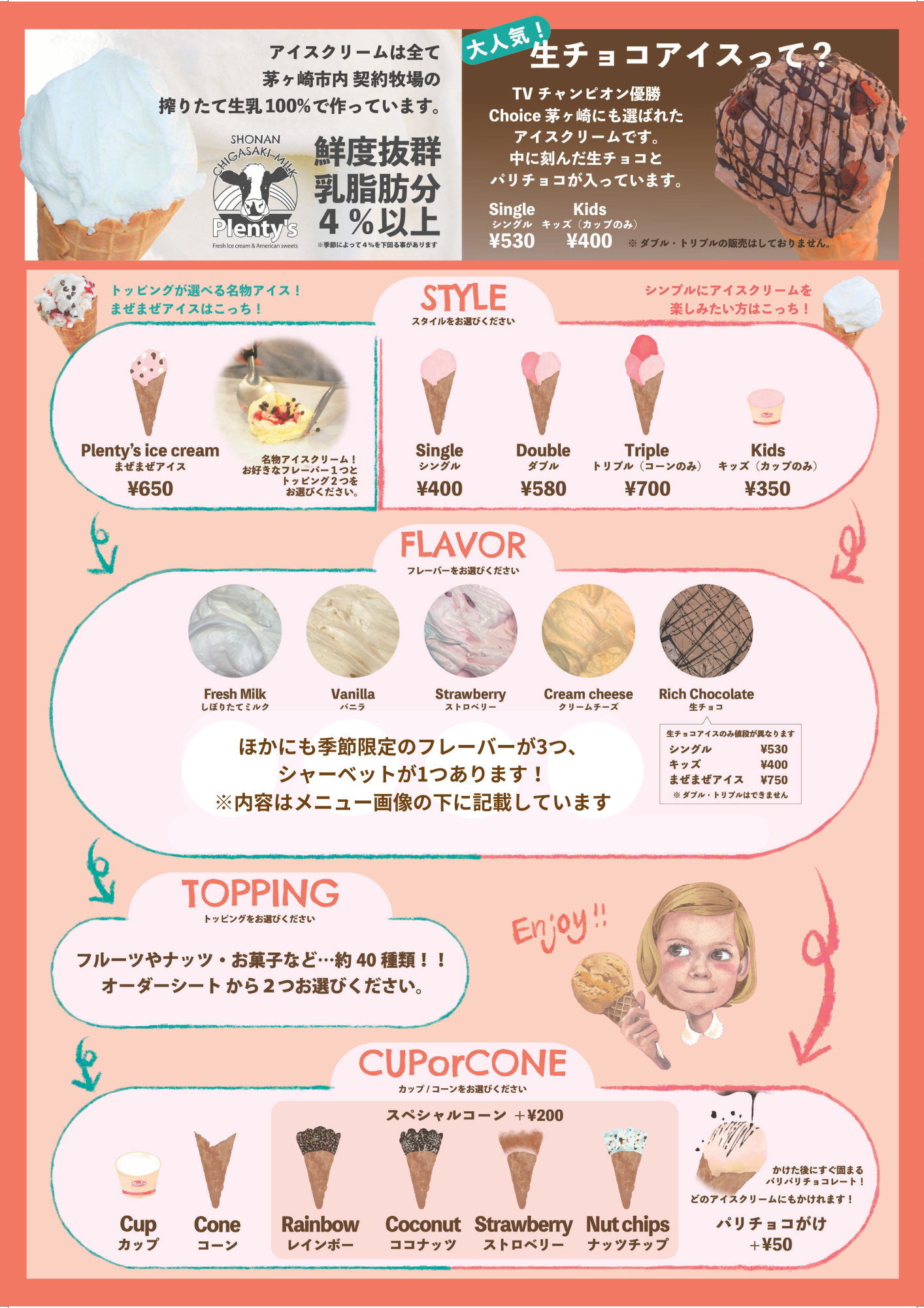 Plenty’s Menu Sheet 2023.11.072026.03.01 【今月のフレーバー】 バニラ、生チョコ、ストロベリー、クリームチーズ、ミルク、ホワイトチョコラズベリー、さくら、ピーナッツ、黒ごま豆乳シャーベット ※在庫によって変更があります。店内のアイスケースをご確認ください。 【おすすめトッピング】 Instagramで随時更新しています。